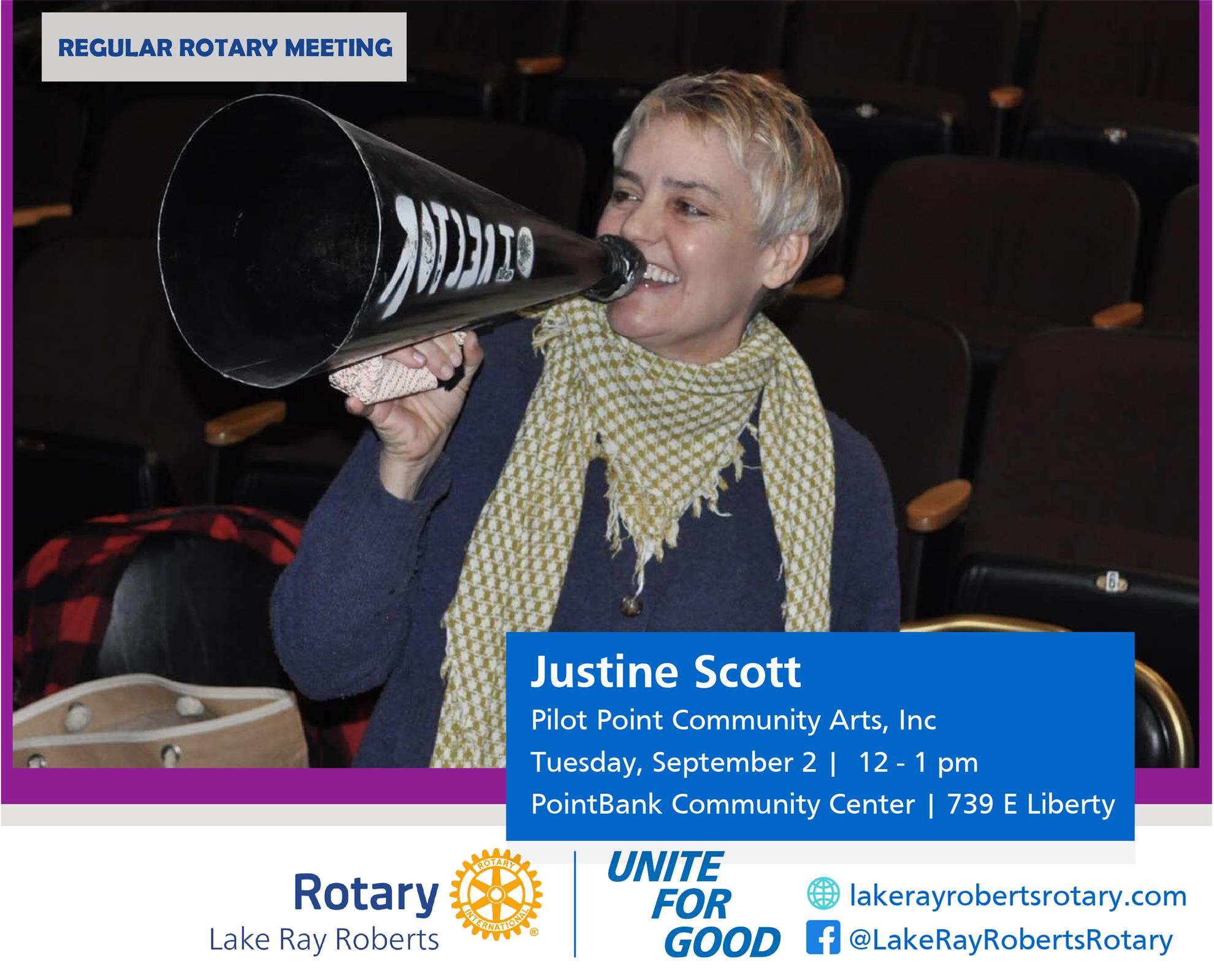 Our guest speaker this week will be Justine Scott, introducing Pilot Point Community Arts, Inc. You might have seen Justine around town, creating murals, curating art shows at the Coffee House or on the stage at The Garage Door Theater. Come hear about the Arts community in Pilot Point!