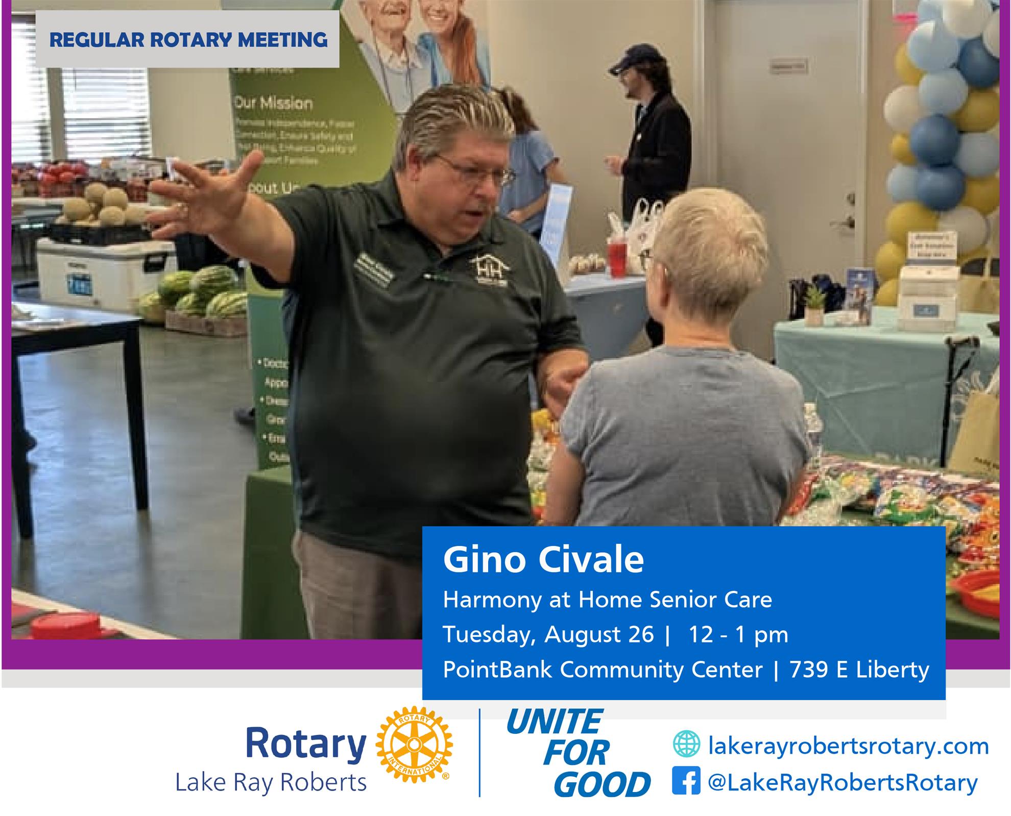Our guest speaker this week will be Gino Civale, the Marketing and Events Coordinator for Harmony at Home Senior Care. Gino will be speaking to us on how Harmony at Home supports local veterans and their spouses. Lunch will be provided, courtesy of PointBank.